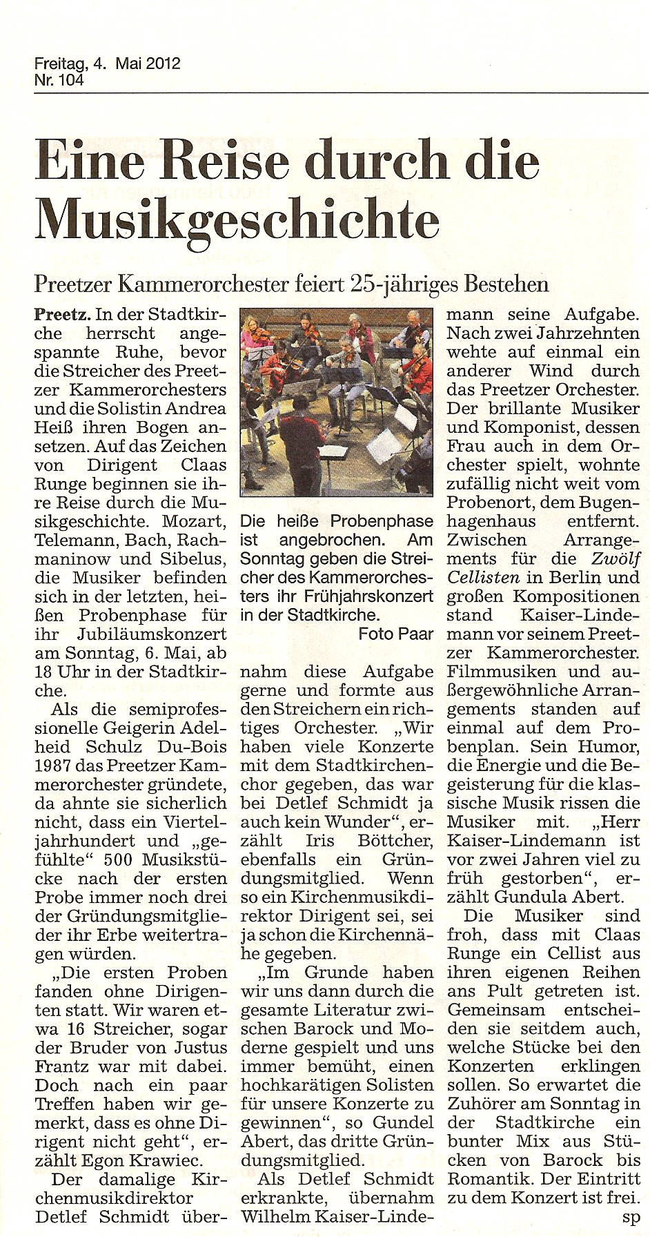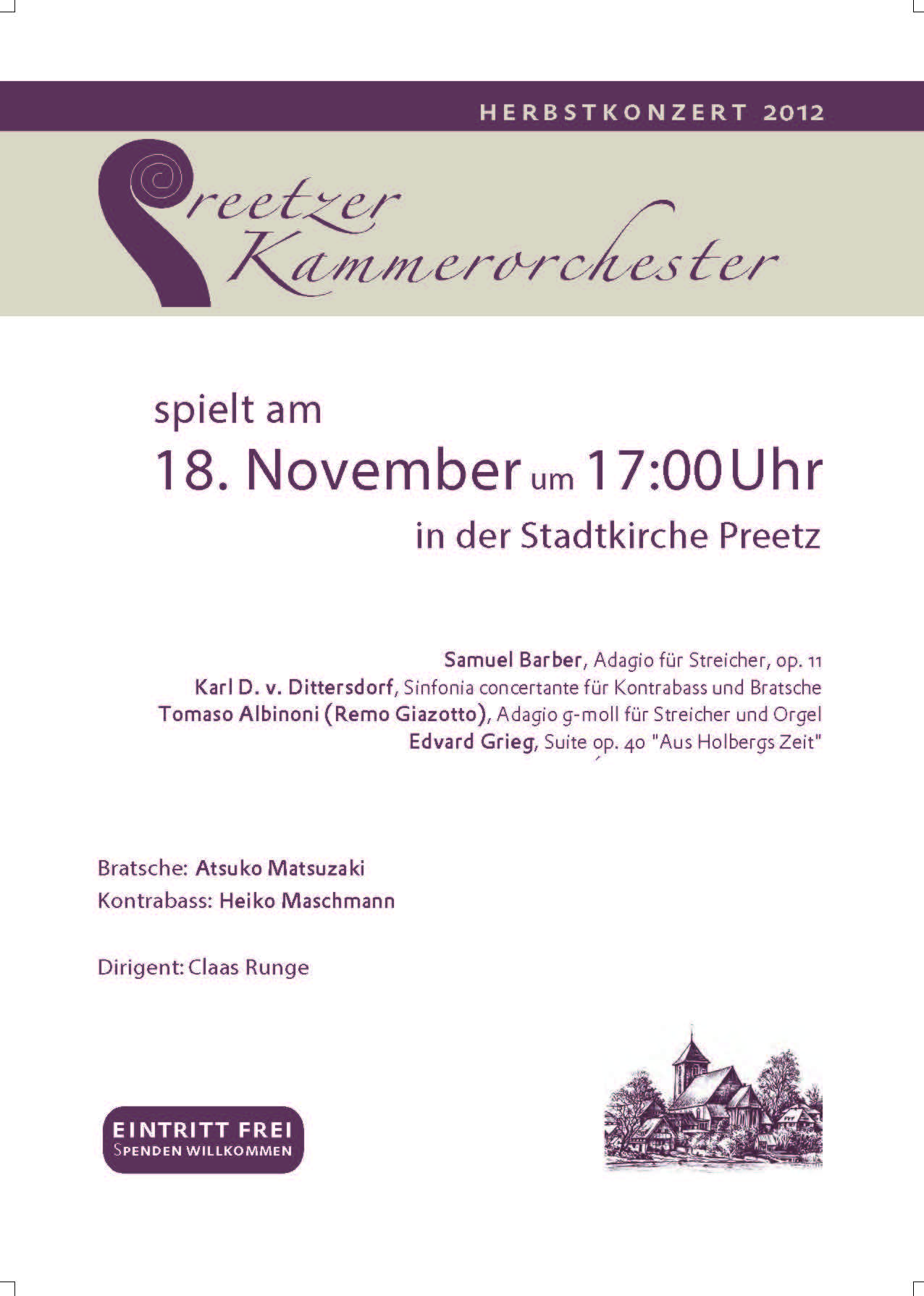 Das Preetzer Kammerorchester ist eine Vereinigung von Laienmusikern aus Preetz und Umgebung, die 1986 von einer Musikergruppe um Adelheid Schulz Du-Bois († 2011) als erster Konzertmeisterin gegründet worden ist. Wir sind primär ein Streicherensemble, das jedoch gern auch mit anderen Instrumentalisten, mit Chor und Gesangssolisten zusammenarbeitet.